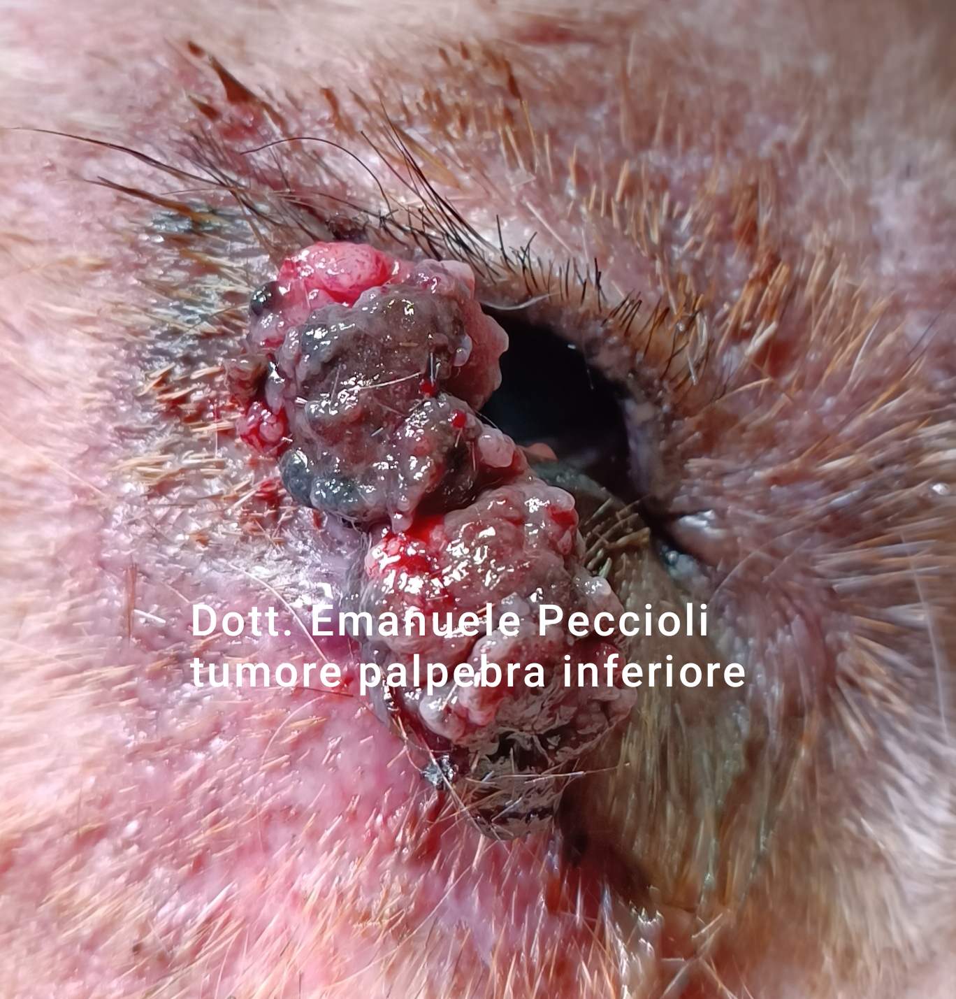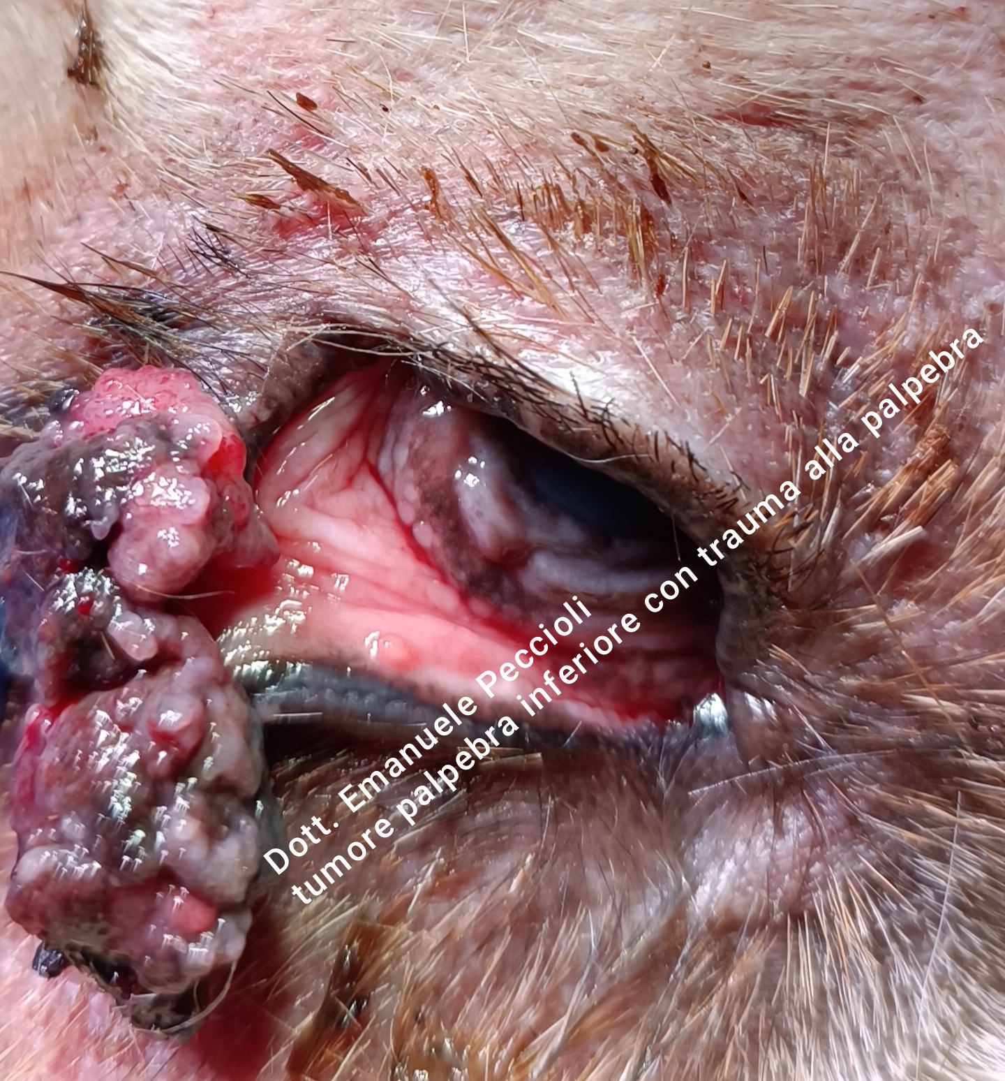 Tumore palpebra inferiore occhio sinistro presente da alcuni anni, a causa del fastidio l'animale si gratta ripetutamente determinando una lesione profonda alla palpebra che porta alla sua lacerazione.