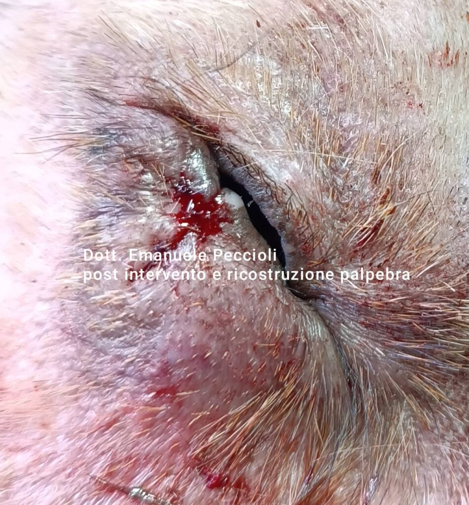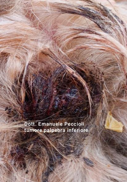 Tumore palpebra inferiore occhio sinistro presente da alcuni anni, a causa del fastidio l'animale si gratta ripetutamente determinando una lesione profonda alla palpebra che porta alla sua lacerazione.